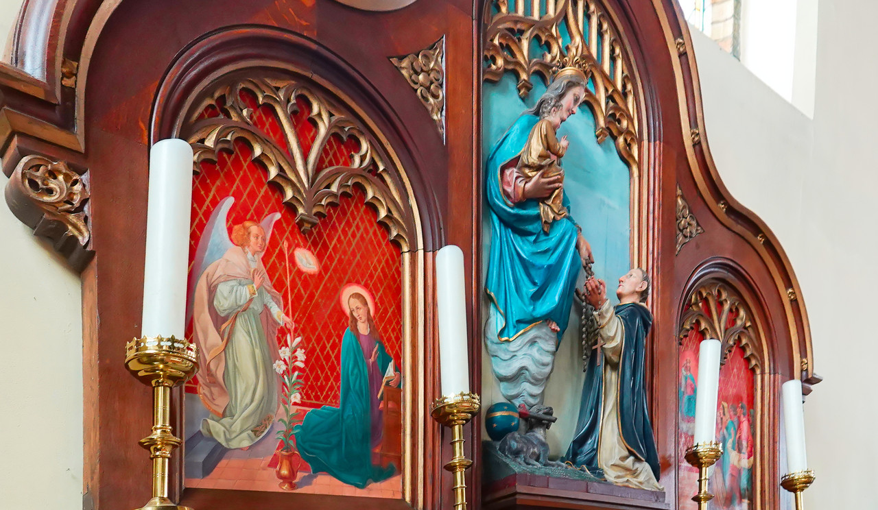 (Afbeelding: Maria-altaar Sint-Vedastuskerk in Vlamertinge: De heilige Dominicus ontvangt de rozenkrans uit de handen van Maria.)